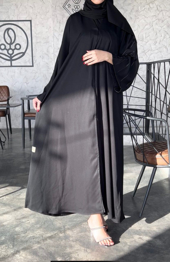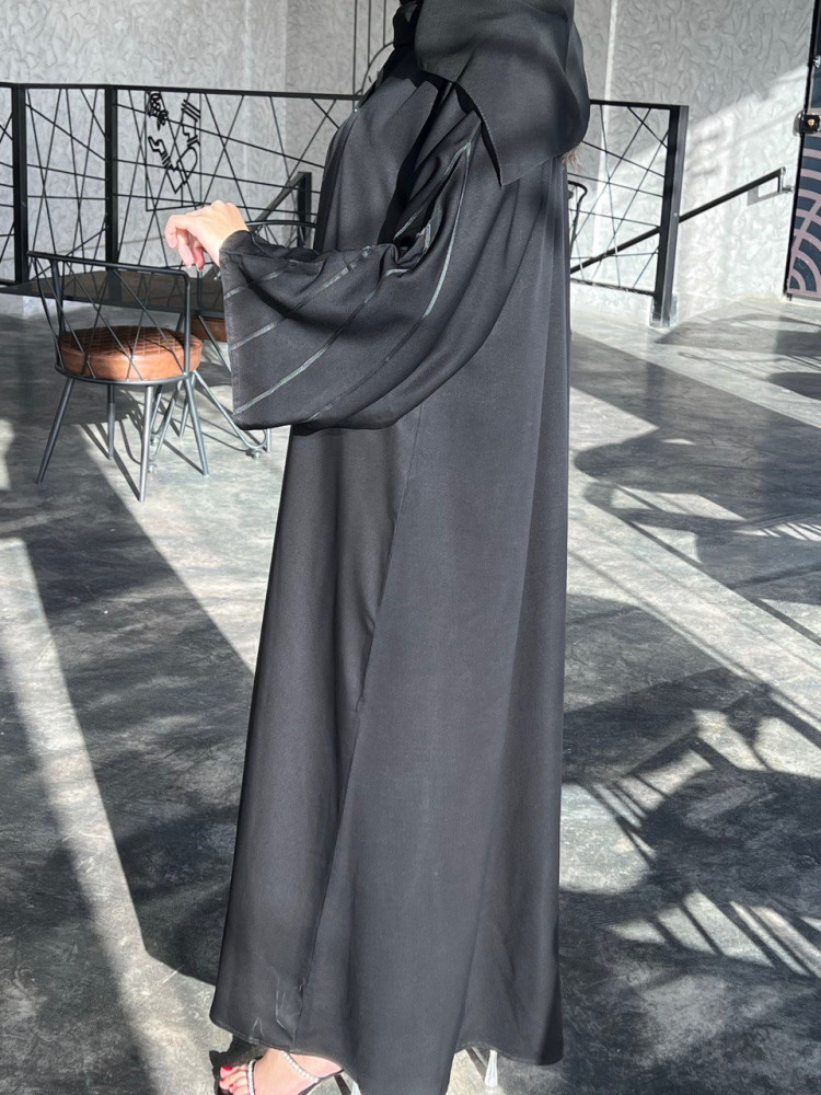 عبايه عمليه القماش صالونا مع قيطان اسود بالاكمام